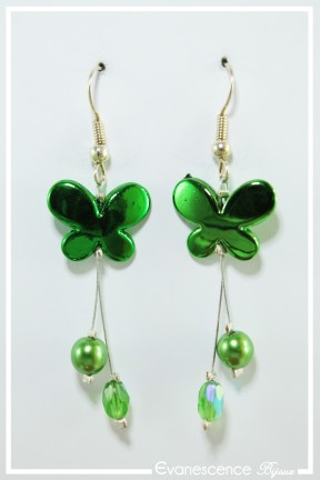 Le papillon en synthétique de couleur verte fait 17 mm de large et les autres perles sont de couleur verte. Les boucles d'oreilles mesurent environ 5,5 cm de long